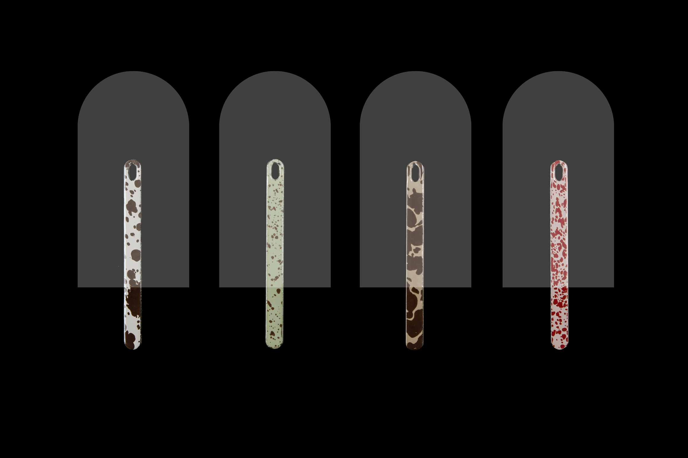Inspired by the bold speckled esthetic and durable qualities of enamelled steel tableware, the smooth sticks are made to be collected after enjoying your ice cream. Each colour scheme represents a classic flavour which are, from left to right, stracciatella, mint chocolate, swiss chocolate and strawberry.
